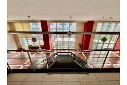 * Three sides of the building are clad in glass.
